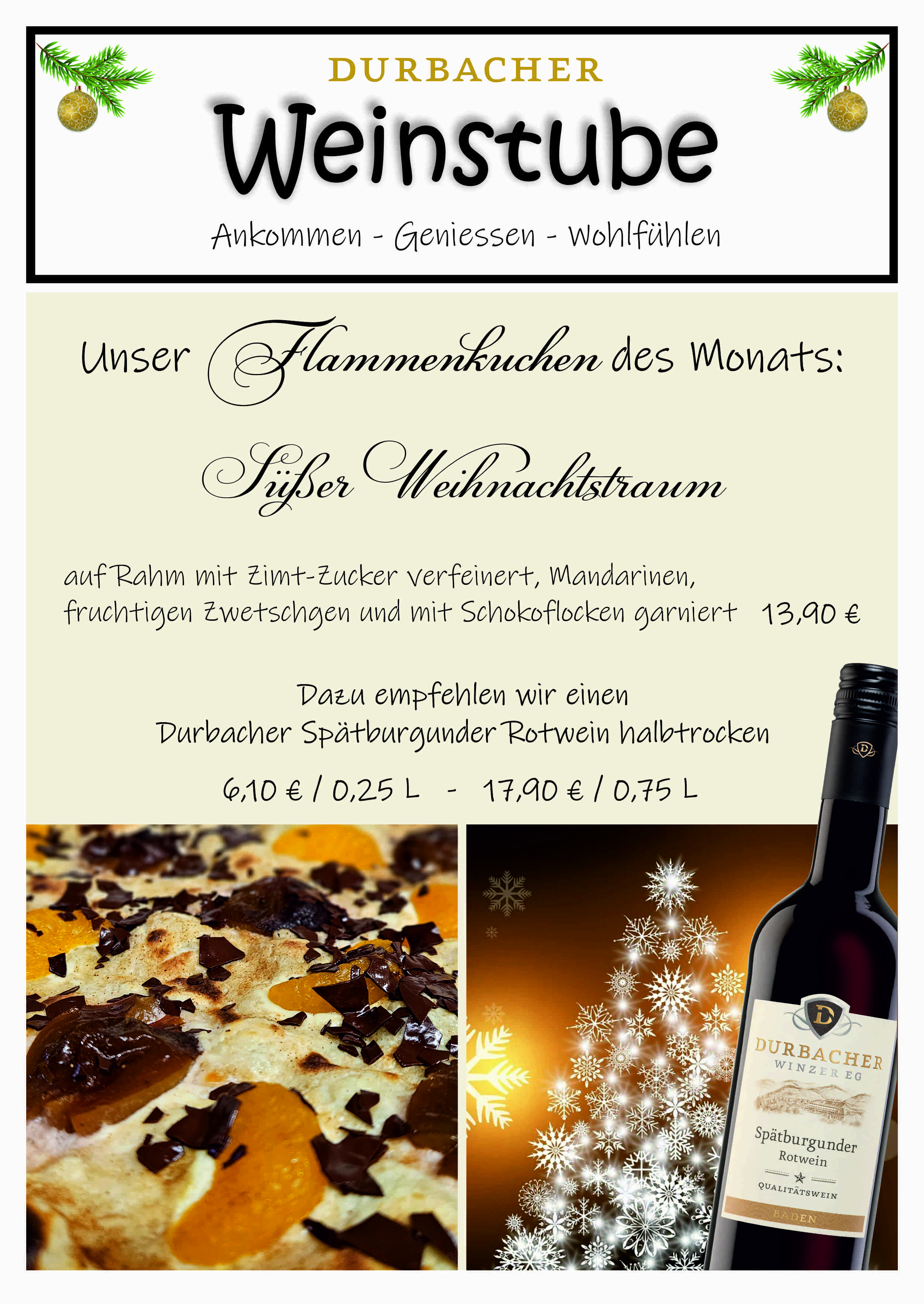 Schwarzwald-Parfait (mit Kirschwasser) - garniert mit heißen Kirschen klein: € 7,10 Portion: € 9,10 Apfel-Flammenkuchen mit Calvados flambiert Klein: € 12,30 Portion: € 14,70